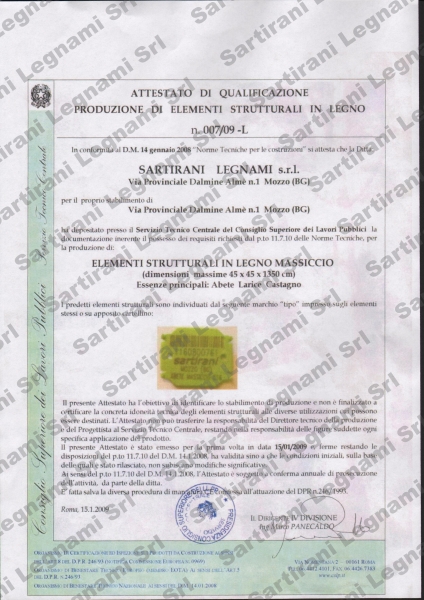 In data 15 Gennaio 2009 il Ministero delle Infrastrutture ci ha rilasciato l'Attestato di Qualificazione per la Produzione di prodotti strutturali in legno massiccio.
